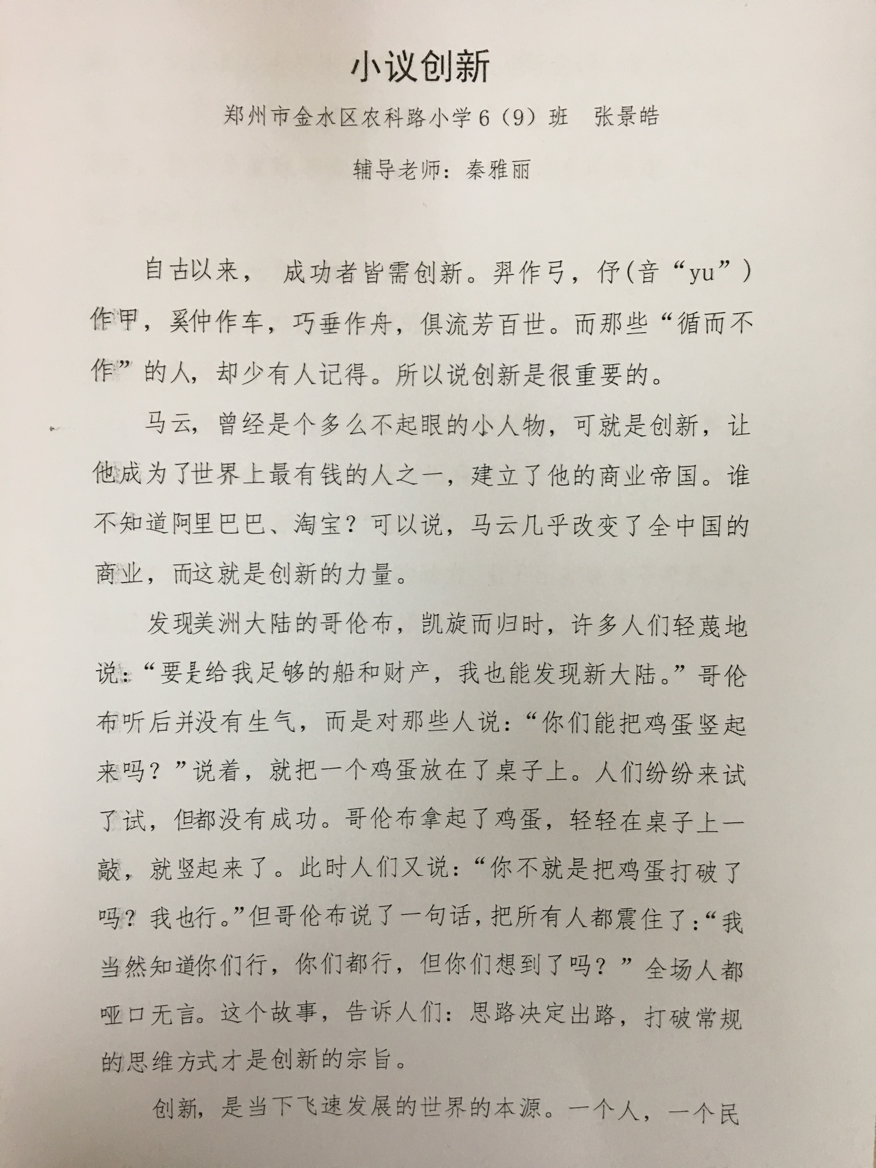 指导老师:秦雅丽 所属学校:郑州市金水区农科路小学