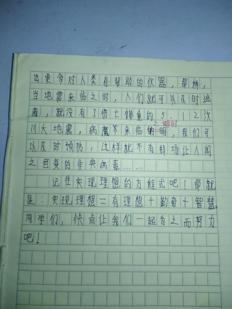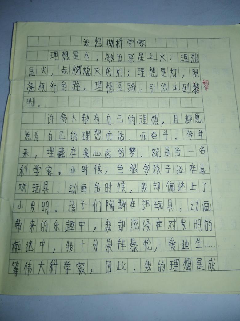 这是一篇描写我的理想的文章,通过读你的文章老师知道,你是一个有理想、有目标的孩子。生动形象的写出了理想的重要。全文语言流畅自然,较为生动,是一篇不错的习作。