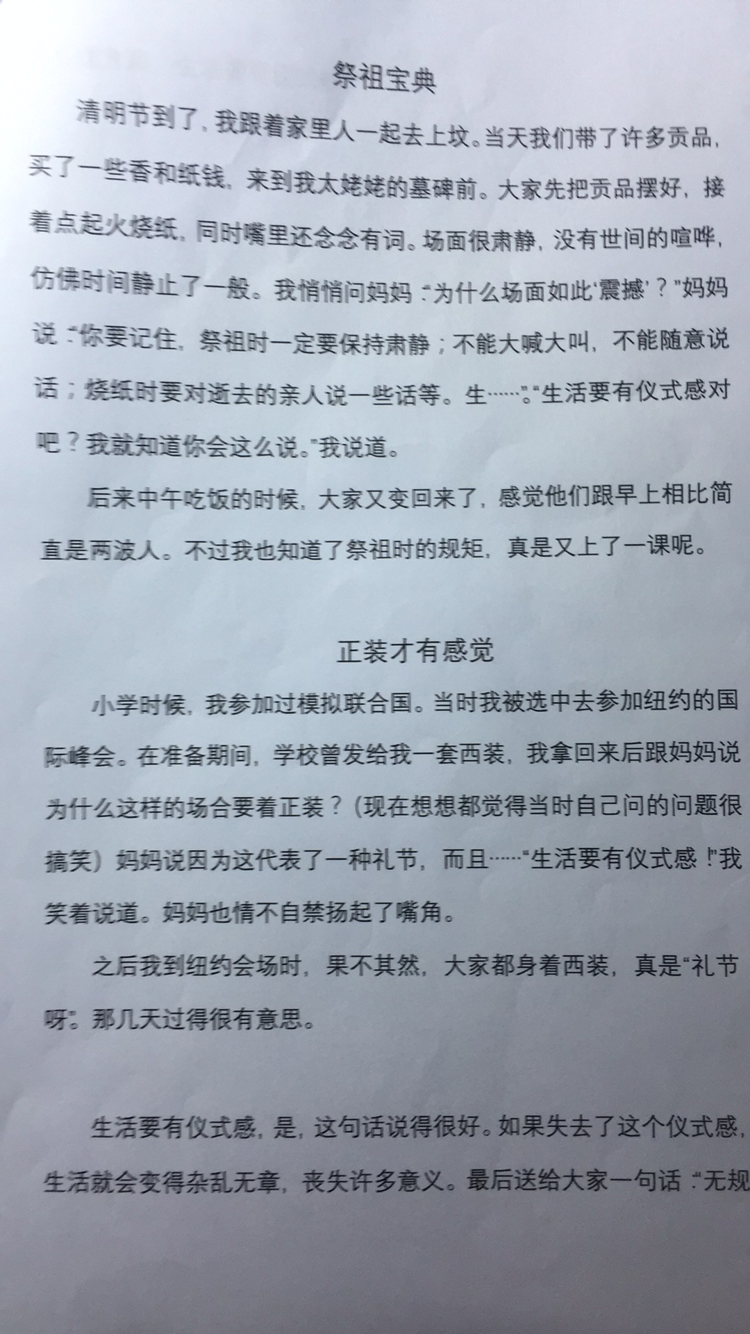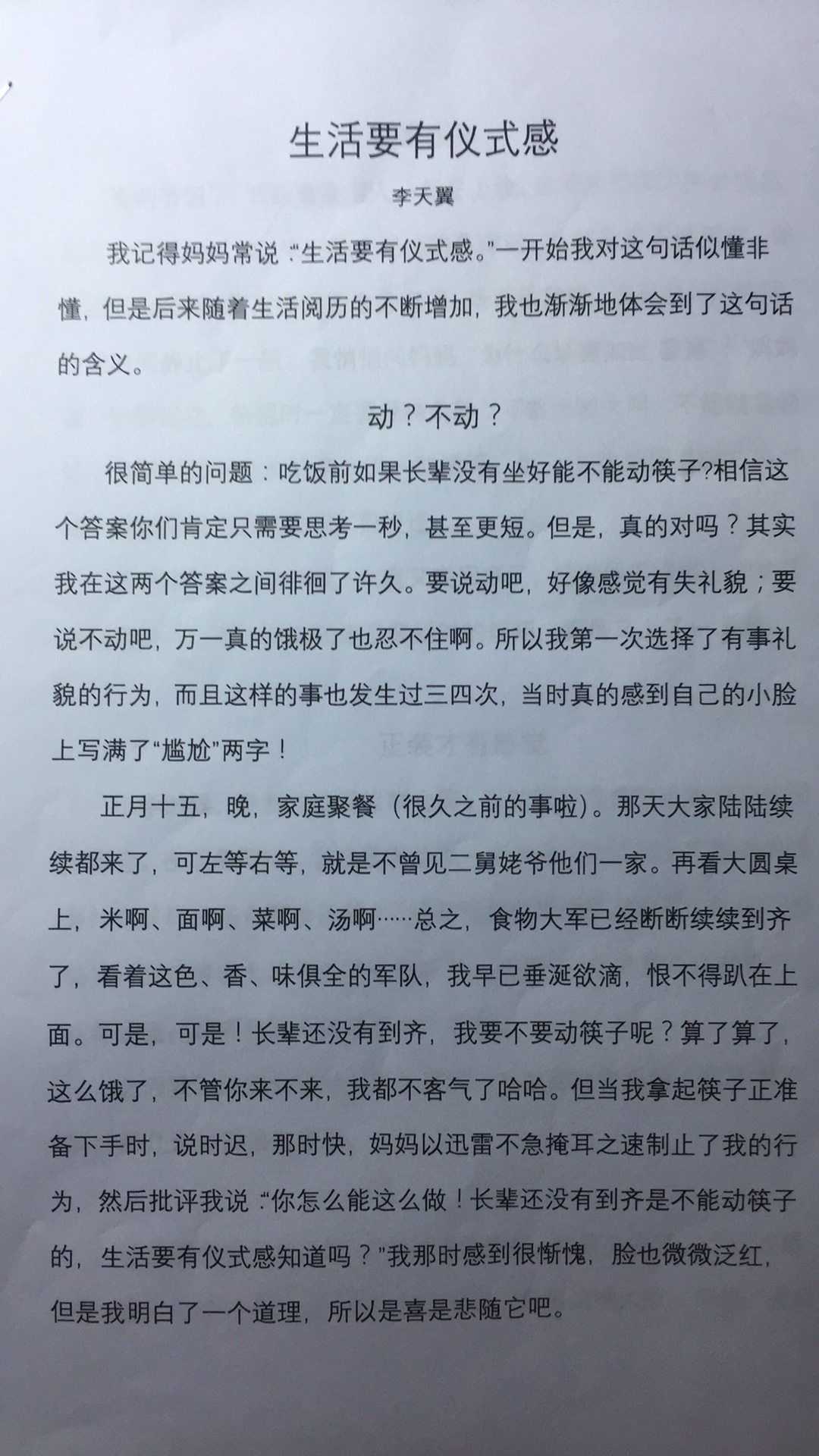 | 小作者选材别有匠心,选取生活中几个非常典型的场景进行镜头式特写,能够让人如临其境同时会引发深深地思考,也会去遵循生活中的各种仪式,从而让生活更庄严而有温度。本文虽然语言朴实,但其选材的独到,构思的巧妙,的确让人耳目一新,确实是一篇佳作。 |