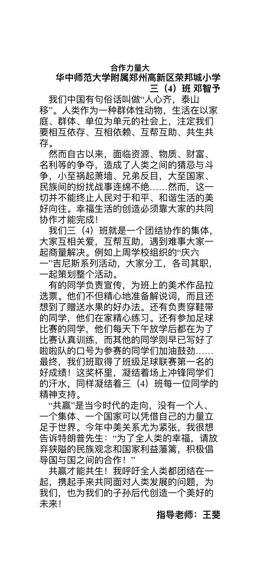 指导老师:王斐 所属学校:华中师范大学附属高新区荣邦城小学