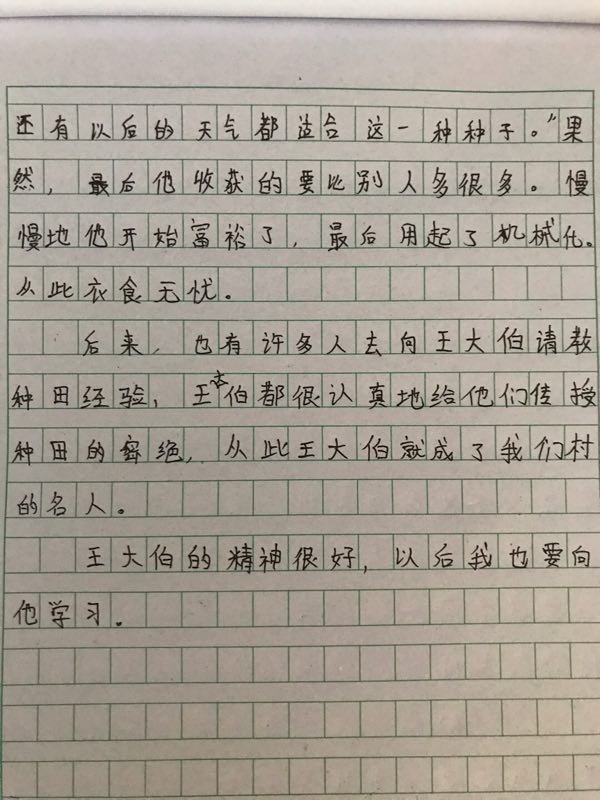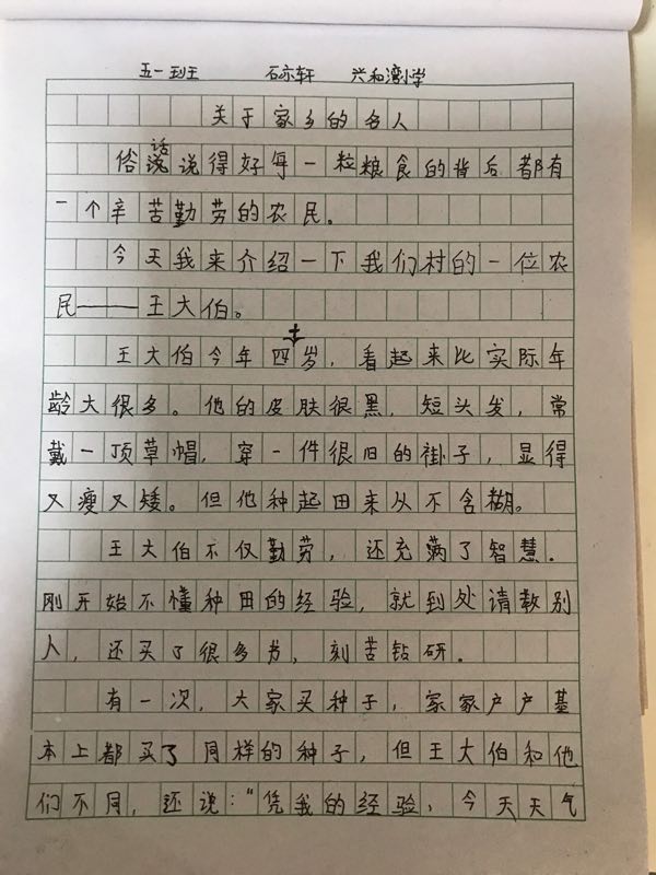 孩子的这篇文章首先内容紧扣题目,人物描写细致,通过一件事来表现了人物对性格。但是题目不够新颖,字体工整程度有待提高,有乱画乱涂现象。