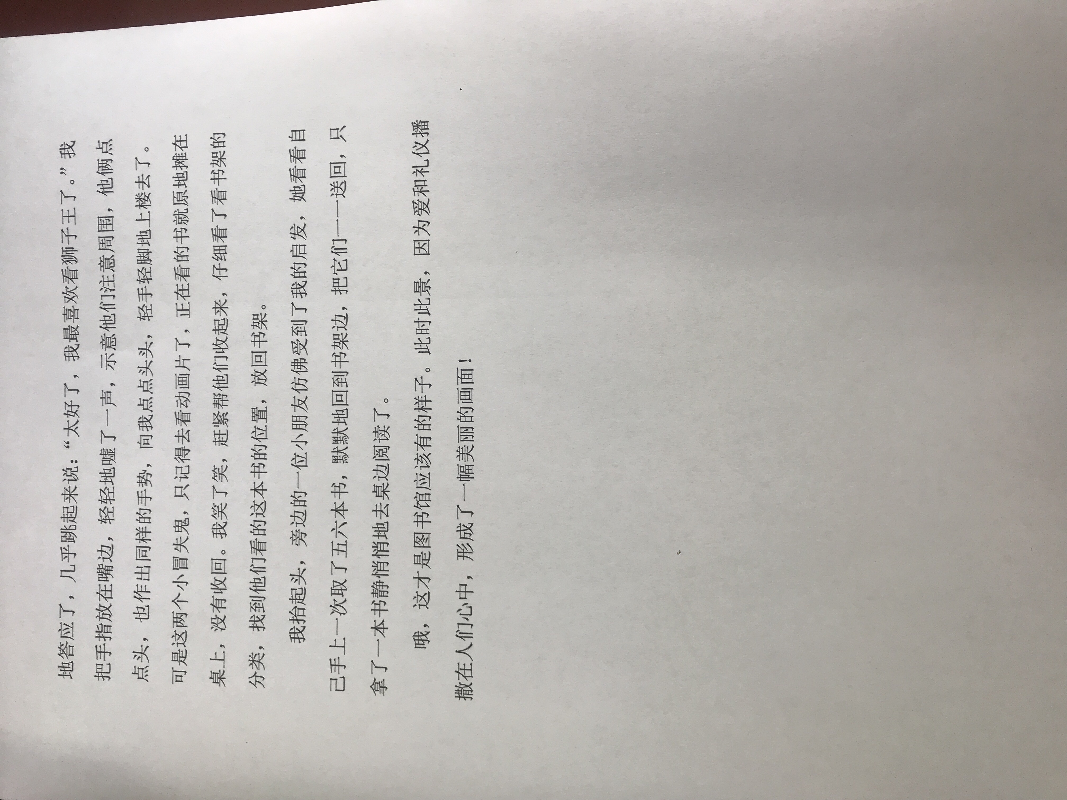 (5) 一扭头,看见两个和我年龄差不多的男孩子在阅览室里捧着两本书,叽叽喳喳地争论个不停。我凑过去一听,他们正在讨论动画片的情节,我说:“我也喜欢看动画片,楼上的电影放映室正在放动画片《狮子王》,我们一起去看吧。”两个小伙伴愉快地答应了,几乎跳起来说:“太好了,我最喜欢看狮子王了。”我把手指放在嘴边,轻轻地嘘了一声,示意他们注意周围,他俩点点头,也作出同样的手势,向我点点头头,轻手轻脚地上楼去了。可是这两个小冒失鬼,只记得去看动画片了,正在看的书就原地摊在桌上,没有收回。我笑了笑,赶紧帮他们收起来,仔细看了看书架的分类,找到他们看的这本书的位置,放回书架。