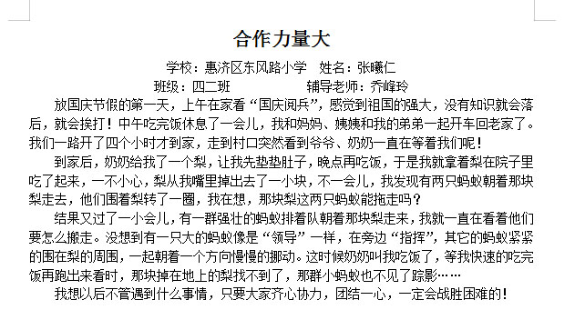 一花独放不是春,百花齐放春满园。一根筷子容易折,一把筷子难折断。大海不拒溪流故成其大,大山不辞息壤故成其高。团结起来力量大,团结协作是中国传统美德,是新中国取得一个又一个胜利的法宝,也是现代社会每个公民的必备素质。小作者能够通过身边事认识到合作的力量,在合作中体会到快乐和成功,文章积极向上,值得肯定。