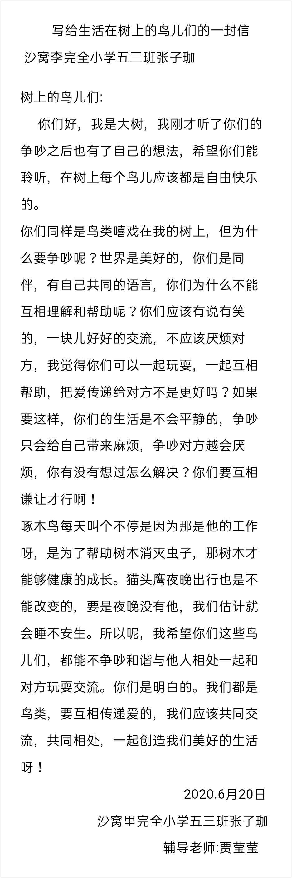 (2) 你们好,我是大树,我刚才听了你们的争吵之后也有了自己的想法,希望你们能聆听,在树上每个鸟儿应该都是自由快乐的。