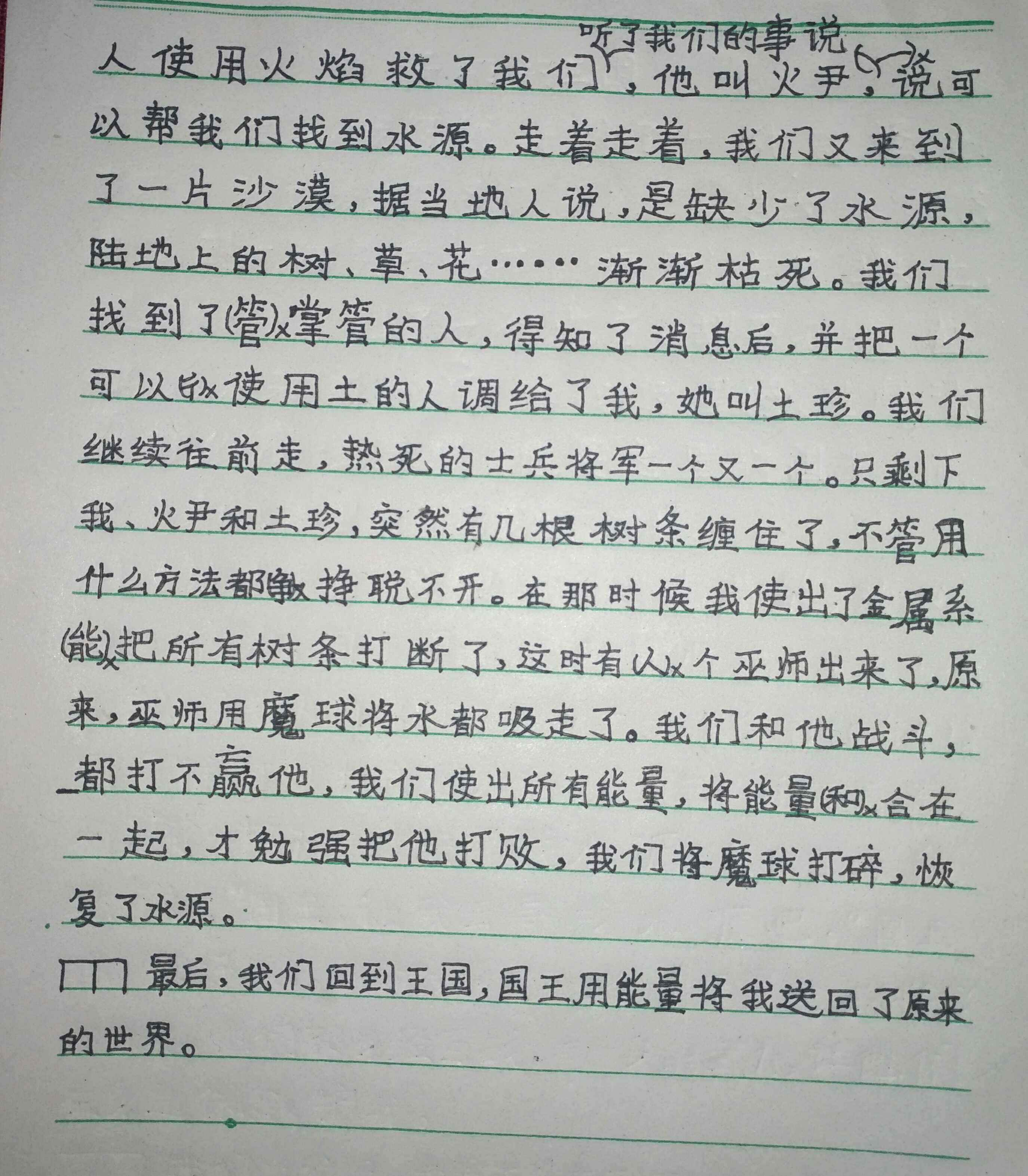 在作文中你发挥了大胆的想象力,因为要寻找奇怪的声音而把自己置身于奇幻的王国,为了给王国找水源,你挺身而出、英勇出征。你在文中实现了对英雄的幻想。