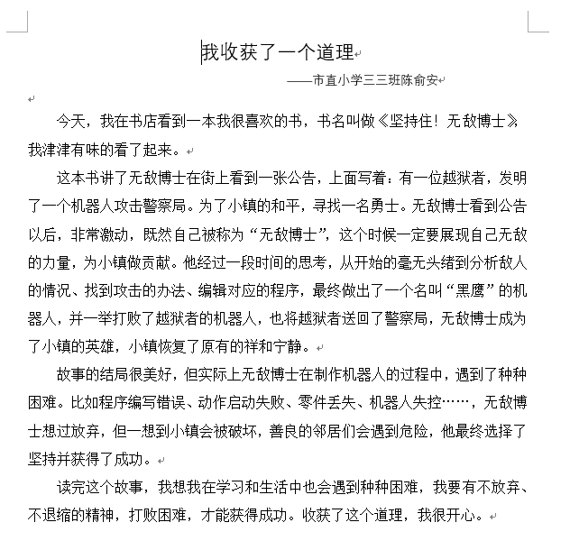 (4) 读完这个故事,我想我在学习和生活中也会遇到种种困难,我要有不放弃、不退缩的精神,打败困难,才能获得成功。收获了这个道理,我很开心。 眉批:应试作文必须在开头就紧扣文题下笔,开头不能与文题一致的内容会被视为与题不符。