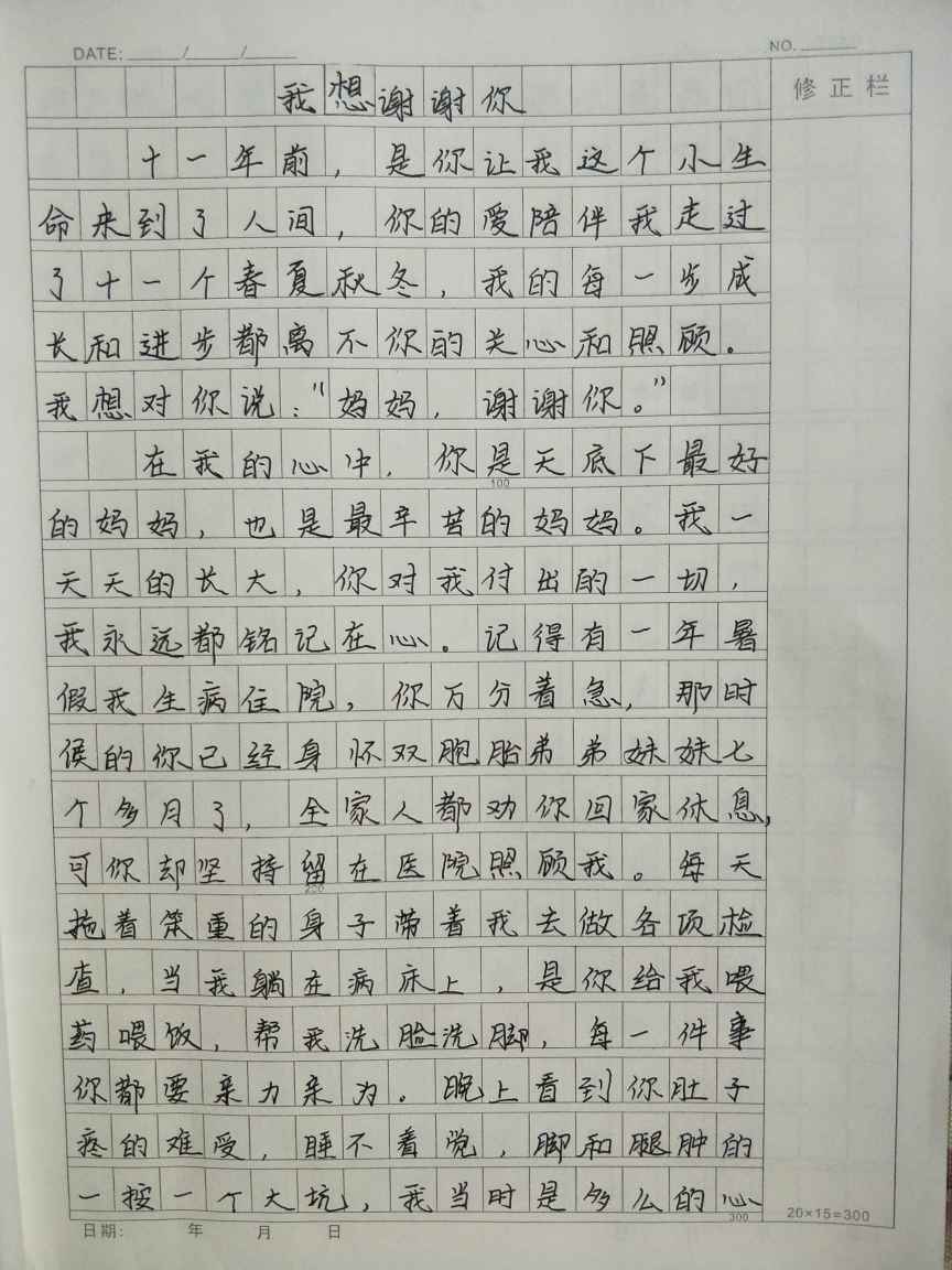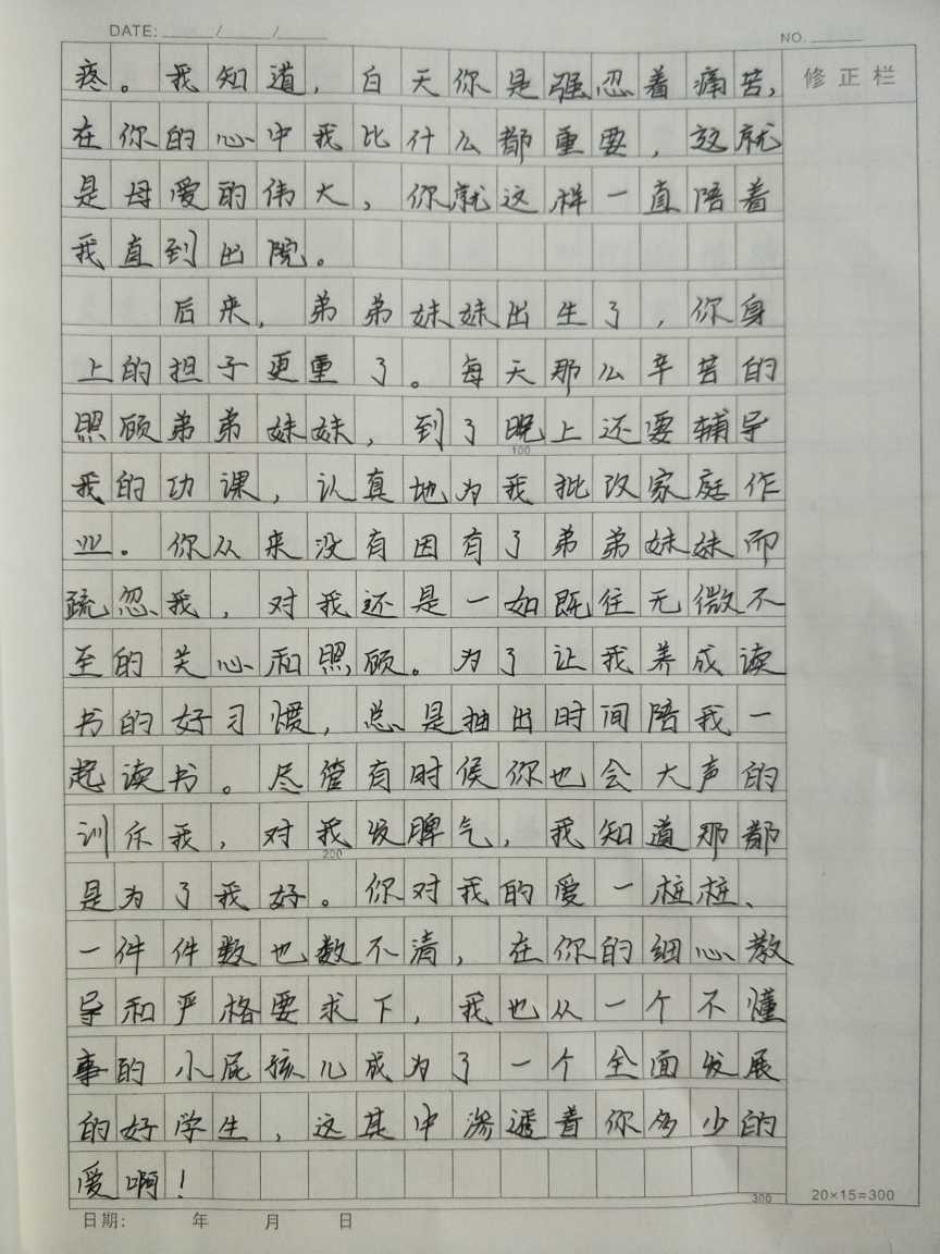 (2) 在我的心中,你是天底下最好的妈妈,也是最辛苦的妈妈。我一天天的长大,你对我付出的一切,我永远都铭记在心。记得有一年暑假我生病住院,你万分着急,那时候的你已经身怀双胞胎弟弟妹妹七个多月了,全家人都劝你回家休息,可你却坚持留在医院照顾我。每天拖着笨重的身子带着我去做各项检查,当我躺在病床上,是你给我喂药喂饭,帮我洗脸洗脚,每一件事你都要亲力亲为。晚上看到你肚子疼的难受,睡不着觉,脚和腿肿的一按一个大坑,我当时是多么的心疼。我知道,白天你是强忍着痛苦,在你的心中我比什么都重要,这就是母爱的伟大,你就这样一直陪着我直到出院。 眉批:动作过程描述简明扼要。