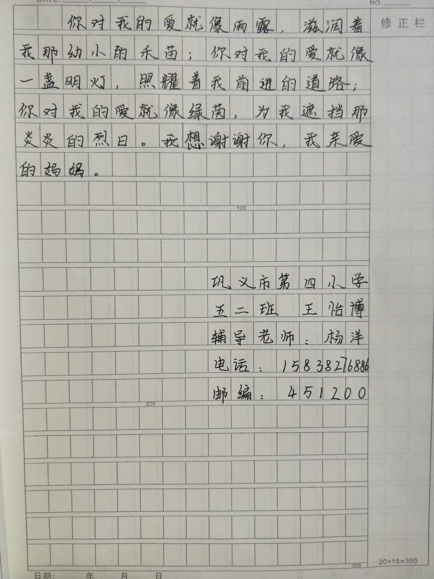 (4) 你对我的爱就像雨露,滋润着我那幼小的禾苗;你对我的爱就像一盏明灯,照耀着我前进的道路;你对我的爱就像绿茵,为我遮挡那炎炎的烈日。我想谢谢你,我亲爱的妈妈。 眉批:语句简洁明快。