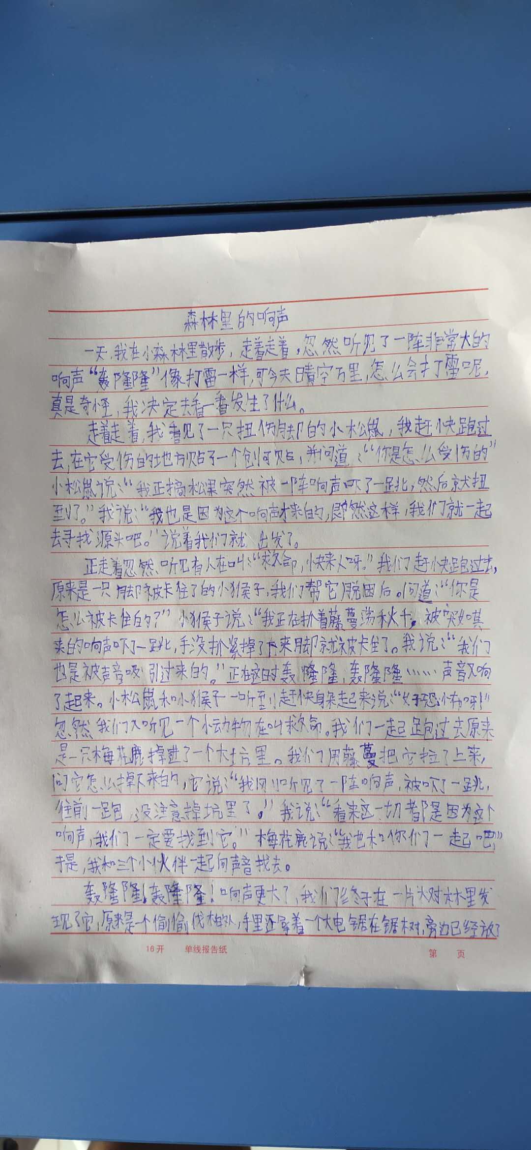 (3) 走着走着,我看见了一只扭伤脚的小松鼠,我赶快跑过去,在它受伤的地方贴了一个创可贴,并问道:“你怎么受伤的”。小松鼠说:“我正在摘松果,突然被一阵响声吓了一跳,然后就扭到了”,我说:“我也是因为这个响声才来的,既然这样,我们就一起去寻找源头吧”,说着我们就出发了。 眉批:个别标点使用不当。