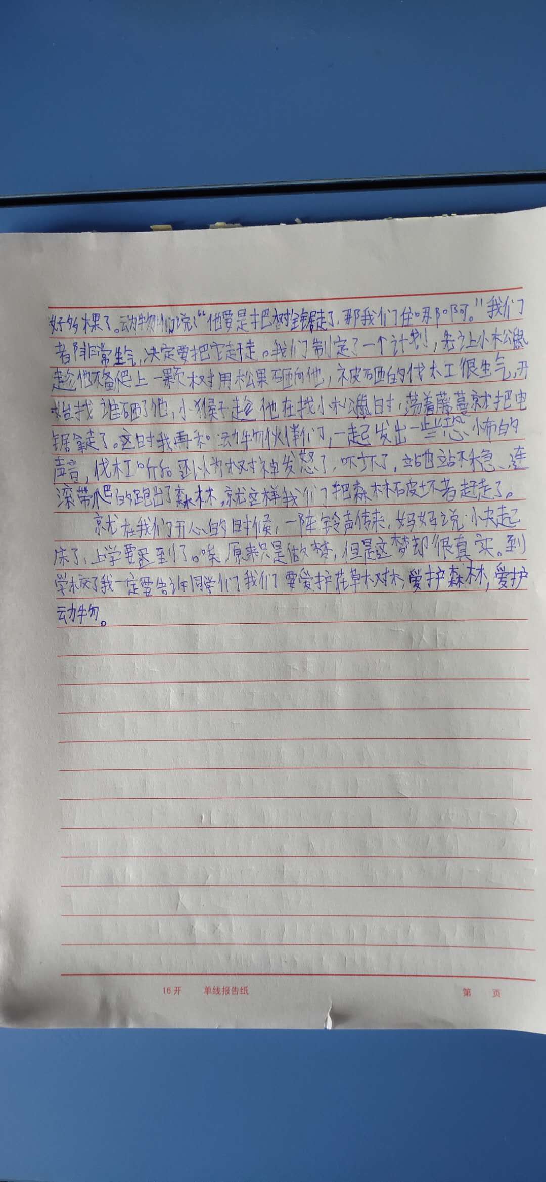(6) 就在我们开心的时候,一阵铃声传来,妈妈说:“快起床,上学要迟到了”,唉!原来只是在做梦,但是这梦却很真实,到学校了,我一定要告诉同学们,我们要爱护花草树木,爱护森林,爱护动物。 眉批:书面语积累不够