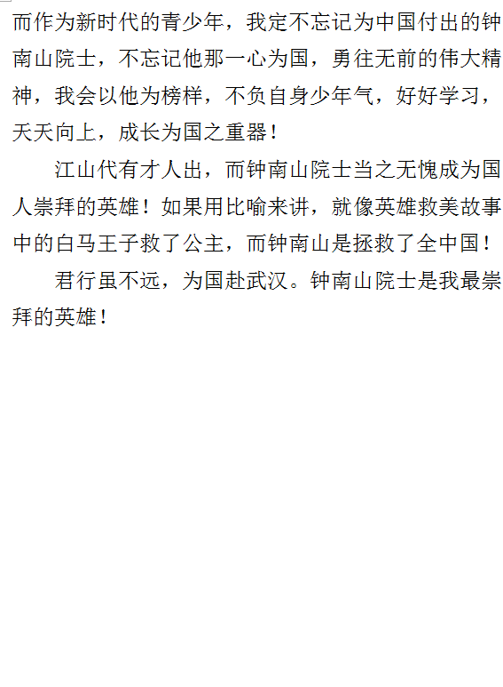 (3) 钟南山院士的爱国精神受到了全国人民的赞扬。“把最危重的病人送到我这来”他一句振聋发聩的话语,掷地有声,让全国乃至全世界的人们看到了中国英雄的高贵精神!终于,在终南山院士的带领下,武汉恢复了昔日的繁华,中国也终山河依旧,国泰民安!而作为新时代的青少年,我定不忘记为中国付出的钟南山院士,不忘记他那一心为国,勇往无前的伟大精神,我会以他为榜样,不负自身少年气,好好学习,天天向上,成长为国之重器!