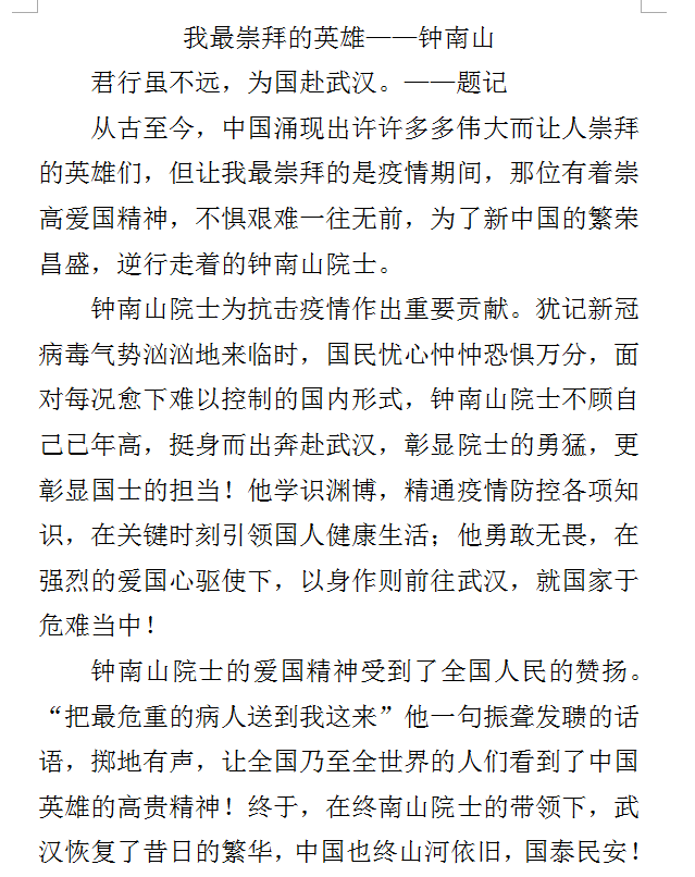 (1) 从古至今,中国涌现出许许多多伟大而让人崇拜的英雄们,但让我最崇拜的是疫情期间,那位有着崇高爱国精神,不惧艰难一往无前,为了新中国的繁荣昌盛,逆行走着的钟南山院士。 眉批:开头语言简洁,符合开头宜简的