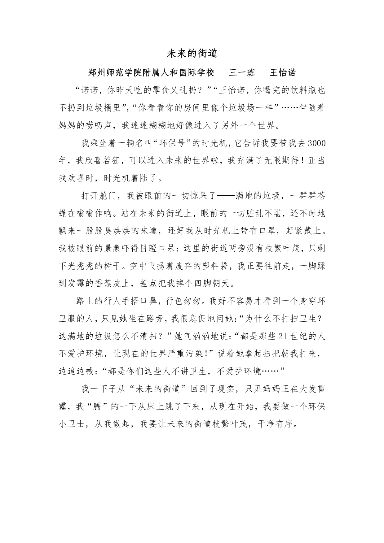 | 未来的街道也许应为我们不注意环保而变得脏乱差;也许应为我们注意环保,而变得干净整洁。相信大家和我一样,都会喜欢第二种情况。小作者极具想象力,写法新颖,用反衬的手法,呼吁大家从此刻起保护环境,保护当下的街道,其实就是为未来做贡献。 |