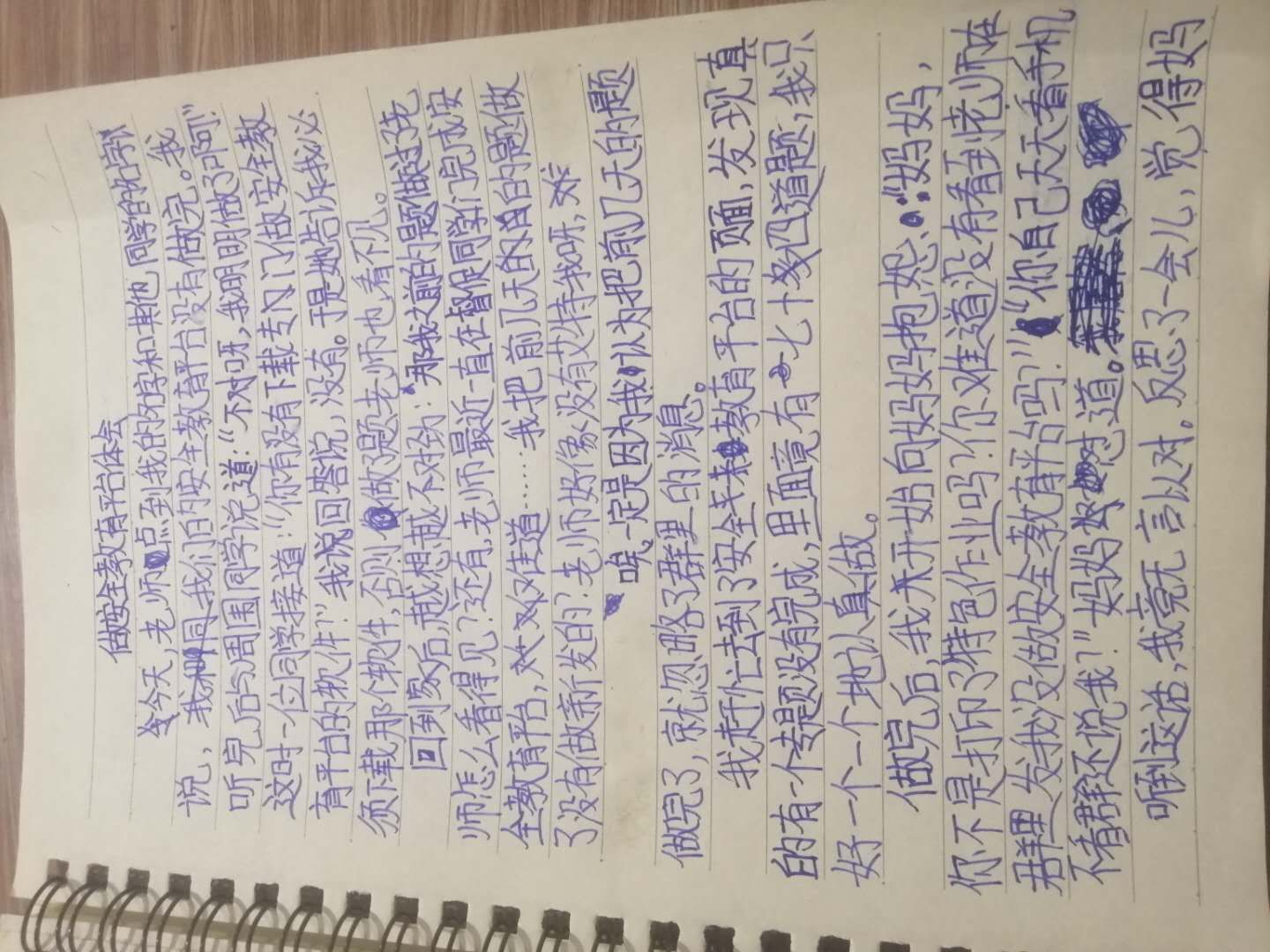 (1) 今天老师点到我的名字和其他同学的名字说,我们的安全教育平台没有做完。我听完后与周围同学说道:“不对呀,我明明做了啊!”这时一位同学接道:“你有没有下载专门做安全教育教育平台的软件?”我回答说,没有。于是她告诉我必须下载那个软件,否则做了题老师也看不见。 眉批:开头过于臃肿。