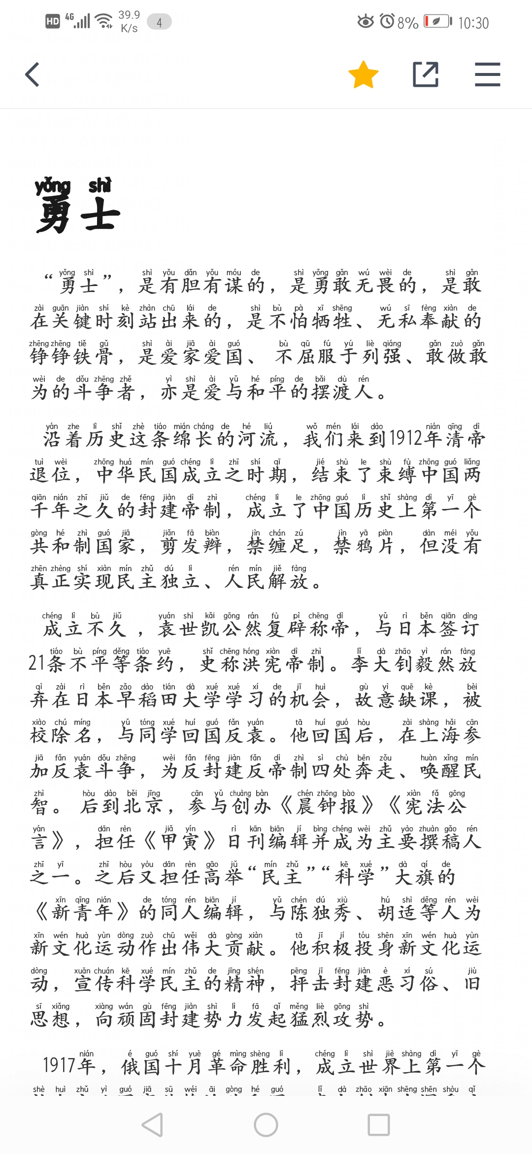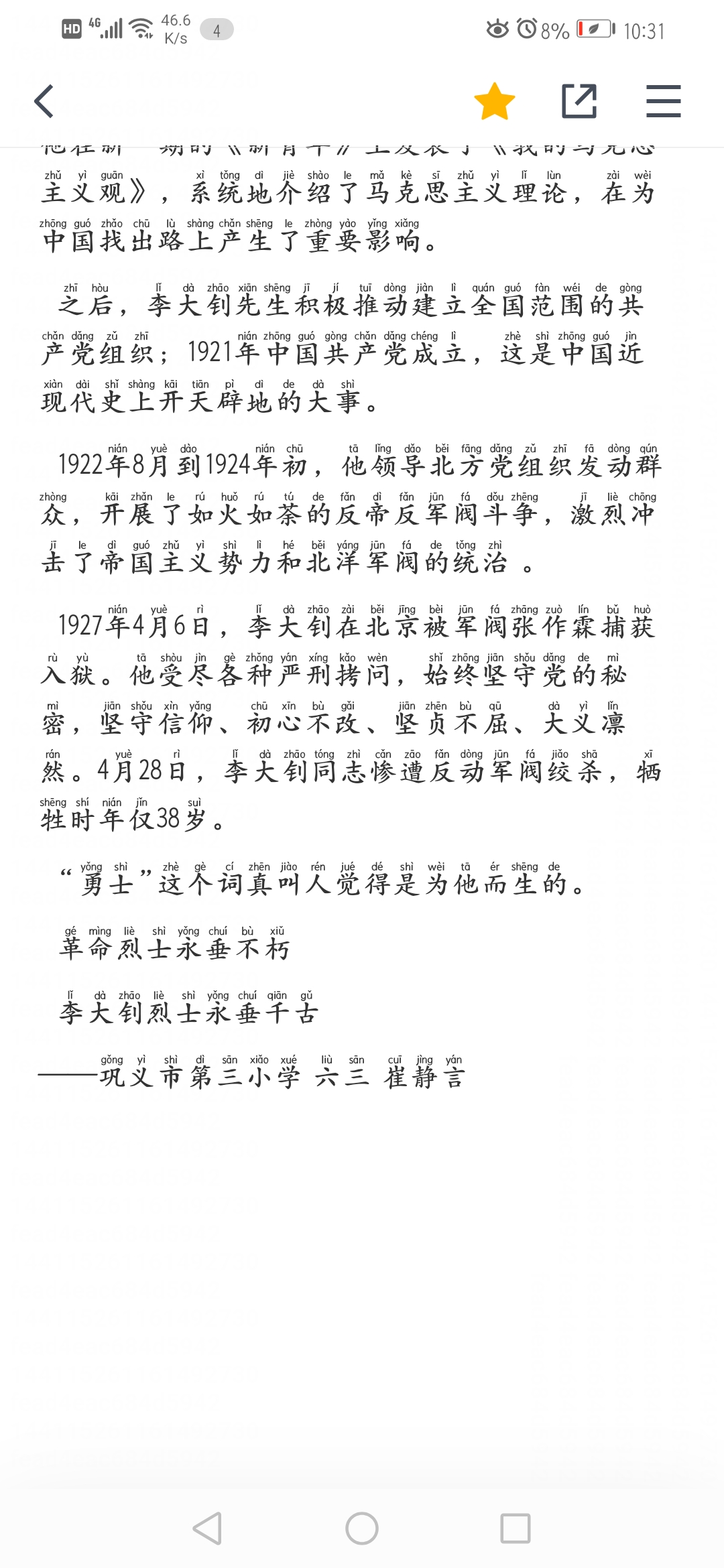 | 《勇士》这篇文章以时间为序,抓住重点历史转折点时李大钊的所作所为,赞扬了李大钊勇敢无畏、不怕牺牲、无私奉献、信念坚定的精神,表达了小作者对革命者李大钊的崇敬和爱戴之情。 全文语言酣畅淋漓,特别是开头的排比句对勇士的特点赞扬,设置悬念,令人热血沸腾之时又疑问逗生。而结尾小又以简短而又铿锵有力的语句,表达了作者对革命先驱——李大钊的敬佩之情,读之令人振奋不已。 本文之所以让人眼前一亮,更主要的原因则是小作者对革命先驱——李大钊在重大历史事件中做出的重大贡献的事例选取很典型,很好的突出了勇士之举,重点突出,详略得当。 |
