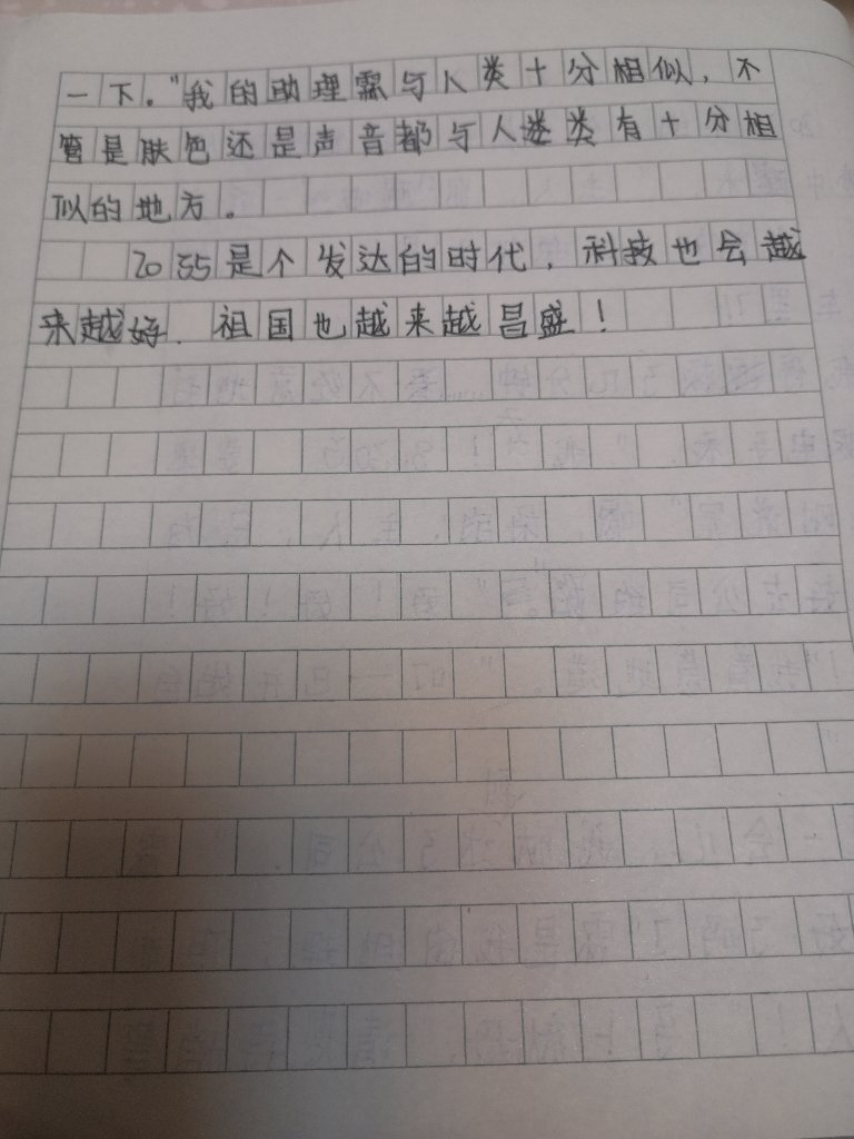 | 这篇想象作文,开篇直接点题,进入正文。你的想象力比较丰富,从未来社会的人工智能入手,带领读者感受下未来的智能社会。从你的作文可以看出,你平时阅读类似的文章比较多,喜欢使用语言描写,期待你能够更加详细具体地把你的想法分享给我们。 |