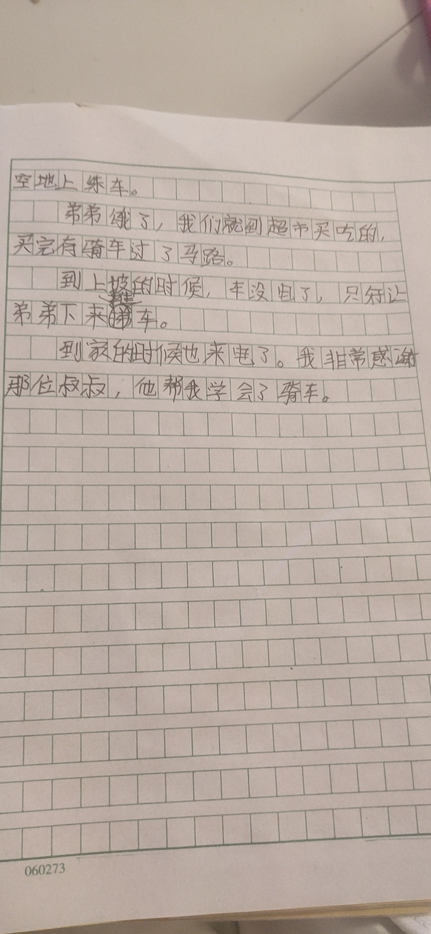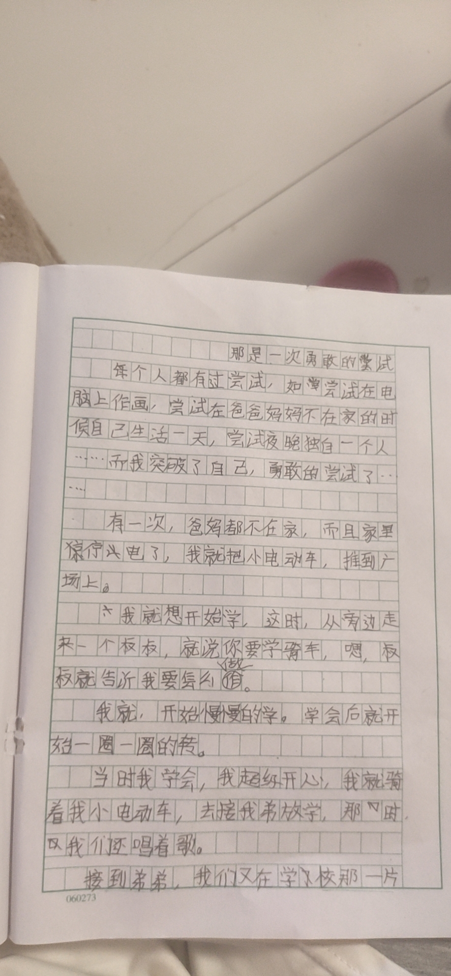 作文应该紧扣尝试来写,你这篇作文写的是第一次学骑车的经历。没有突出勇敢和尝试,好好再修改一下吧。相信你一定能够写出中心突出的文章。