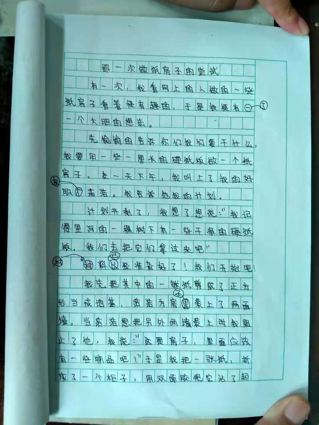 本篇文章紧扣题目,中心突出,通过对话的形式把做纸房子的过程有条理的且清晰的写了出来;书写上字迹工整、页面整洁、修改符号也使用的非常准确! 康孟亚