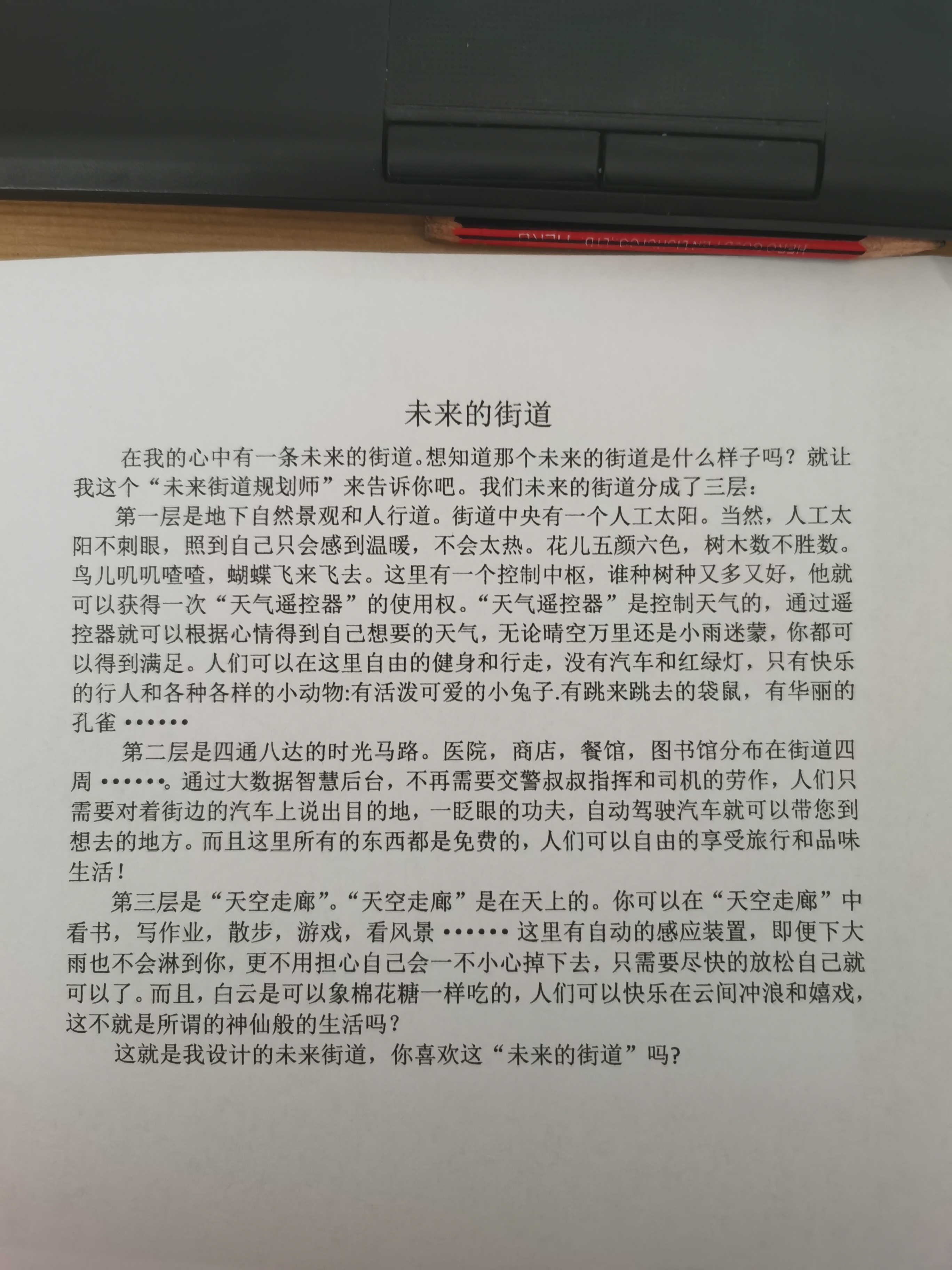 (1) 在我的心中有一条未来的街道。想知道那个未来的街道是什么样子吗?就让我这个“未来街道规划师”来告诉你吧。我们未来的街道分成了三层: 眉批:首句就押题,很好。