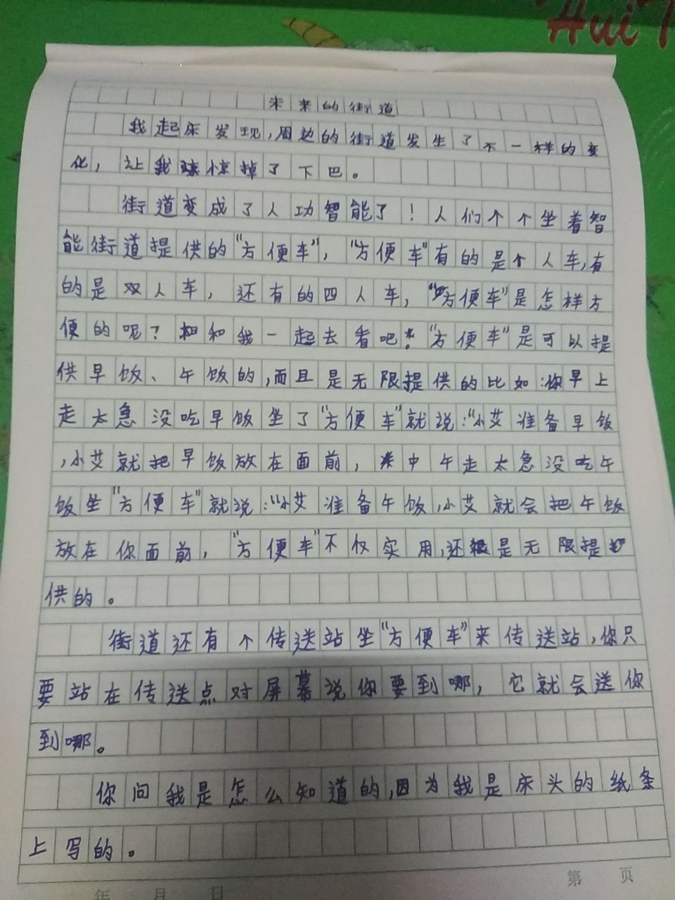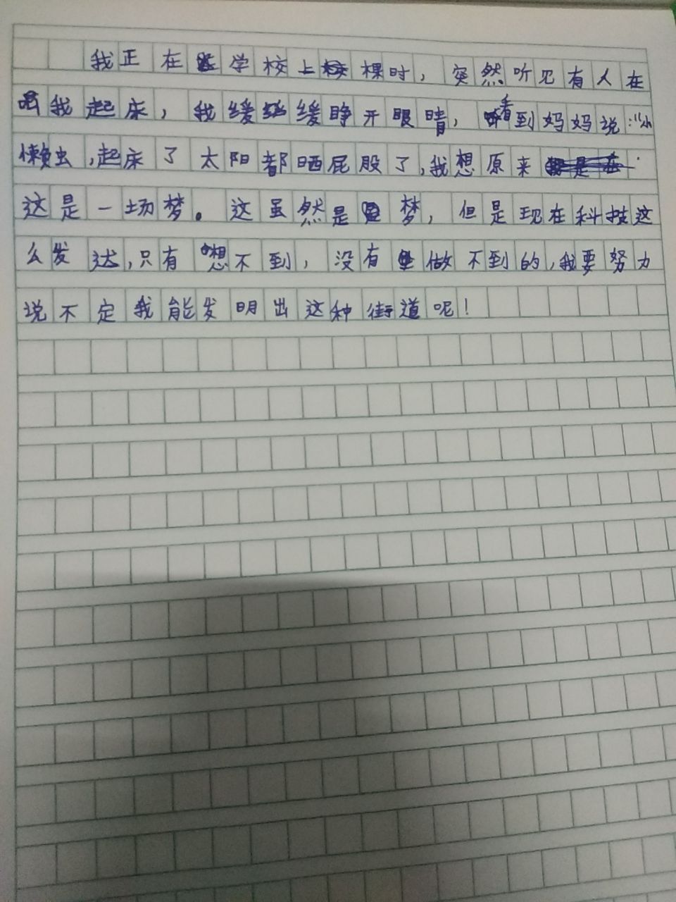 该同学的作文文笔流畅,叙事清晰,对未来有自己的构想,从现实出发,未来发生的可能性较大,虽然是想象的街道,也表达了自己对未来的渴望。
