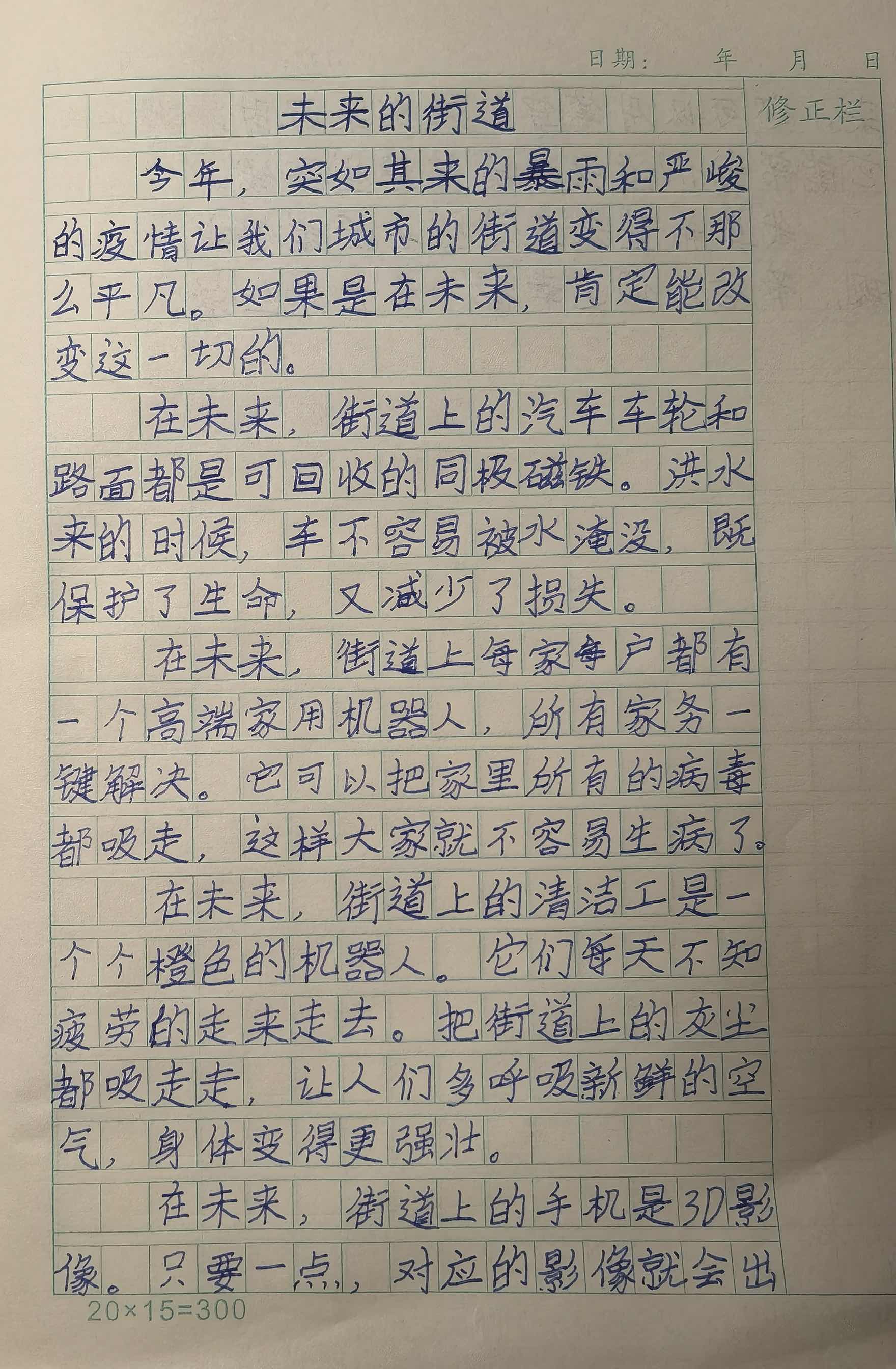 想象力很丰富,很有创意的作文!他结合了当下疫情,提出了不一样的想法和思路,同时也体现了未来的高科技。作文语言生动,内容完整,很好的一篇作文。