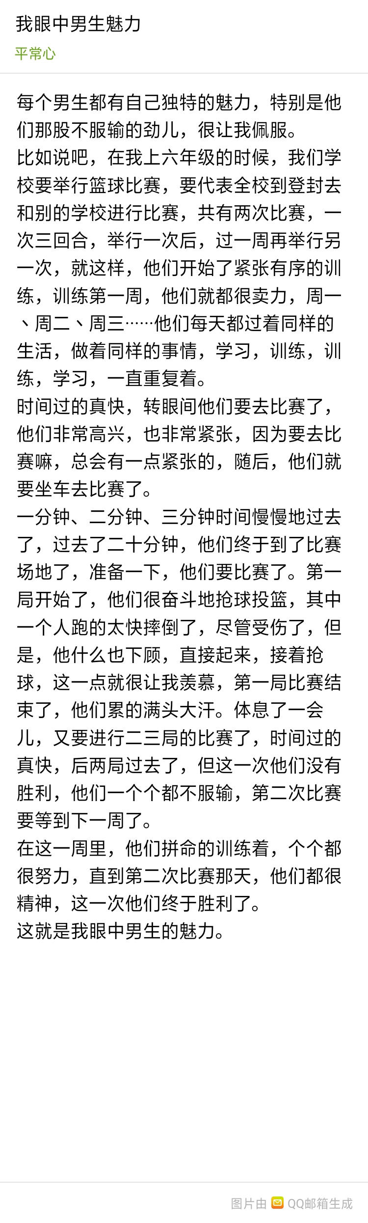 我眼中男生魅力 热650 类别:写人 发表时间:2018-10-07 12:43 已有 651 次阅读 指导老师:刁老师 所属学校:登封新区中强学校
