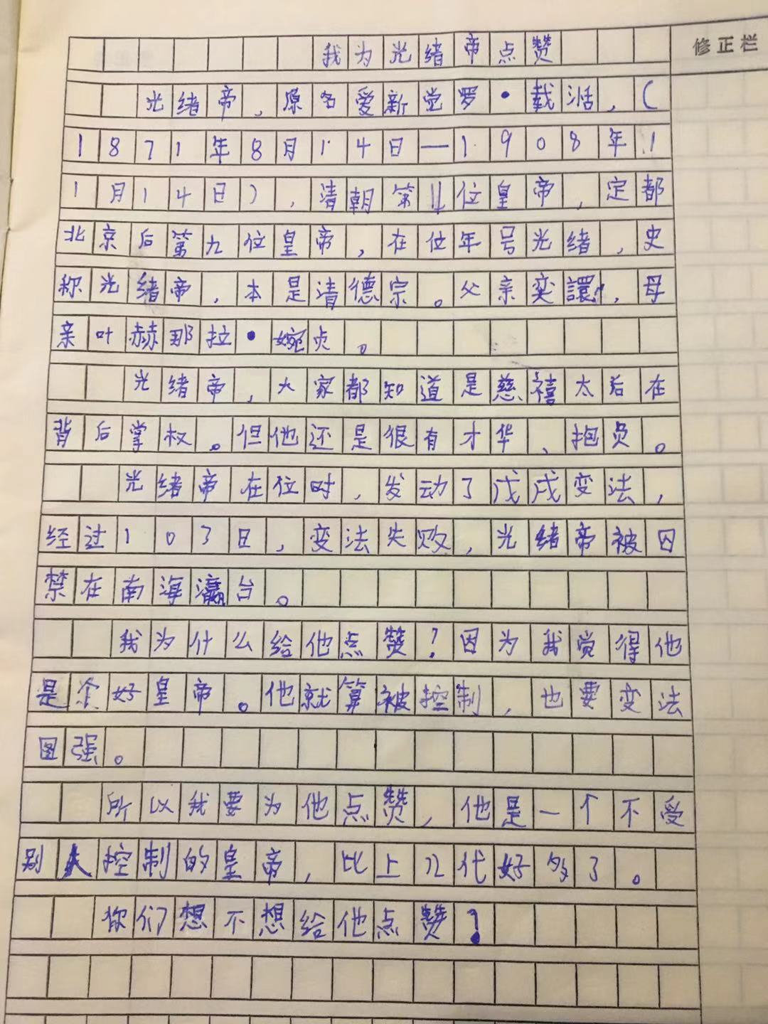 我为光绪帝点赞 热566 类别:写人 发表时间:2019-10-09 13:42 已有 567 次阅读 指导老师:王琛 所属学校:郑州市惠济区东风路小学
