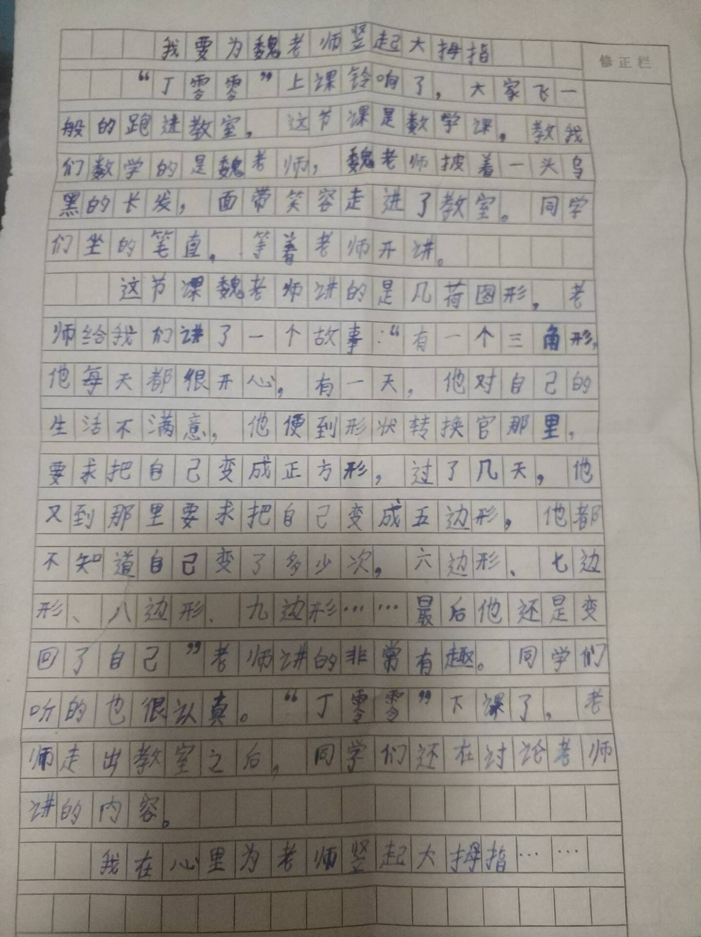 我要为魏老师竖起大拇指 热198 类别:写人 发表时间:2019-10-09 21:49 已有 199 次阅读 指导老师:王永慧 所属学校:郑州市惠济区东风路小学