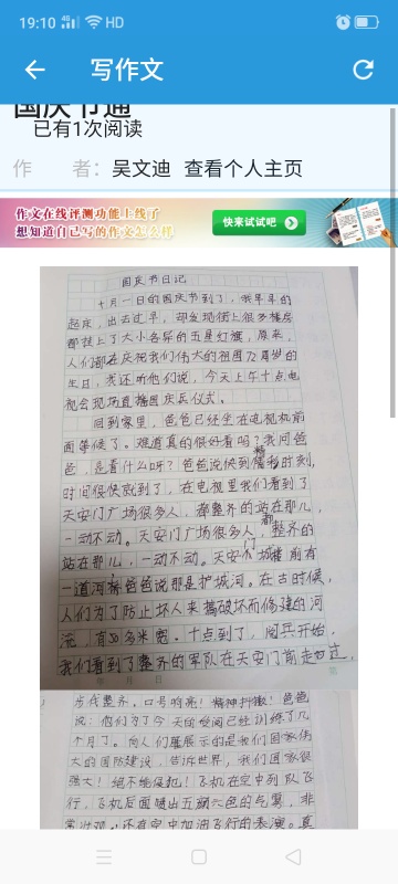国庆节日记 热1667 类别:叙事 发表时间:2021-10-06 20:31 已有 1668 次阅读 指导老师:周超峰 所属学校:西大街青石河学校
